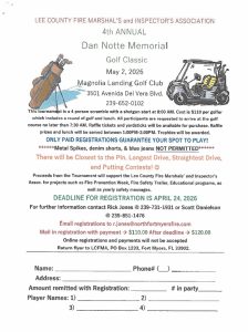 Proceeds from the Tournament will support the Lee County Fire Marshals’ and Inspector’s Assoc. for projects such as Fire Prevention Week, Fire Safety Trailer, Educational Programs, as well as yearly safety messages.